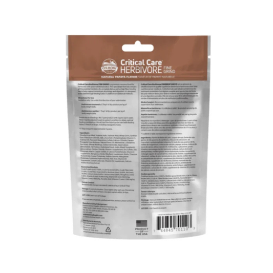 Oxbow Critical Care Herbivore Fine Grind Papaya is a premium recovery nutrition formula designed for herbivores who are unwilling or unable to eat on their own, featuring a smooth fine-grind texture ideal for syringe or tube feeding. Made with high-quality timothy hay and enriched with natural papaya flavor, it provides essential fiber, balanced nutrients, and digestive support to promote steady recovery and overall wellness. Perfect for rabbits requiring critical care, it offers easily absorbable nutrition that supports gut health, energy, and healing when they need it most.Sold out -