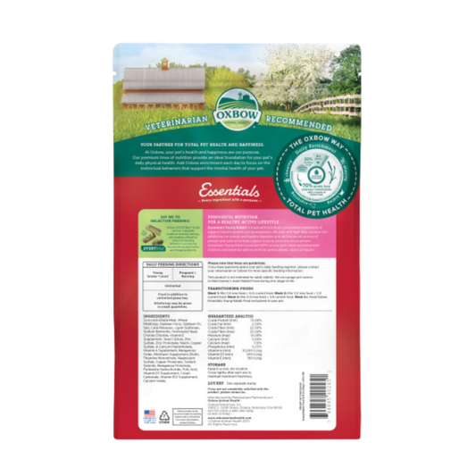 Regular price $32.99Regular priceUnit price / perSale price $32.99Oxbow Essentials Young Rabbit Food is a premium, nutritionally balanced formula specially crafted to support the rapid growth and high energy needs of young rabbits. Made with high-fiber alfalfa hay and essential vitamins and minerals, this diet helps promote healthy digestion, strong bones, and proper development during your bunny’s most important life stage. Each crunchy pellet provides consistent nutrition to encourage healthy eating habits, while the fresh, wholesome ingredients ensure quality you can trust. Perfect for baby and growing rabbits, Oxbow Essentials offers complete daily nourishment that supports vitality, growth, and overall well-being.