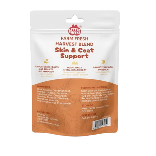 Regular price $16.99Regular priceUnit price / perSale price $16.99Give your bunny a boost of natural nourishment with Little Cheeks Skin & Coat Support—a gentle, nutrient-rich supplement crafted to keep your rabbit’s fur soft, shiny, and healthy. Made from premium, bunny-safe ingredients, this formula supports skin hydration, reduces dryness, and promotes a glossy coat from the inside out. Perfect for bunnies experiencing seasonal shedding, dull fur, or sensitive skin, this supplement provides daily support to keep them looking and feeling their best. Easy to serve and deliciously bunny-approved, Little Cheeks Skin & Coat Support is the perfect addition to your rabbit’s wellness routine, bringing out their natural beauty with every nibble.