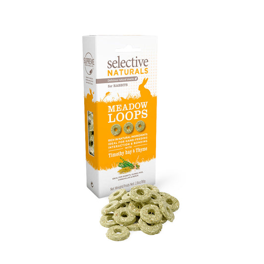 Selective Naturals Meadow Loops are nourishing rabbit treats, expertly formulated with a blend of high-fiber timothy and alfalfa hay, enriched with the delightful aroma of thyme. This healthful treat encourages foraging and adds variety to your small pets everyday diet.
