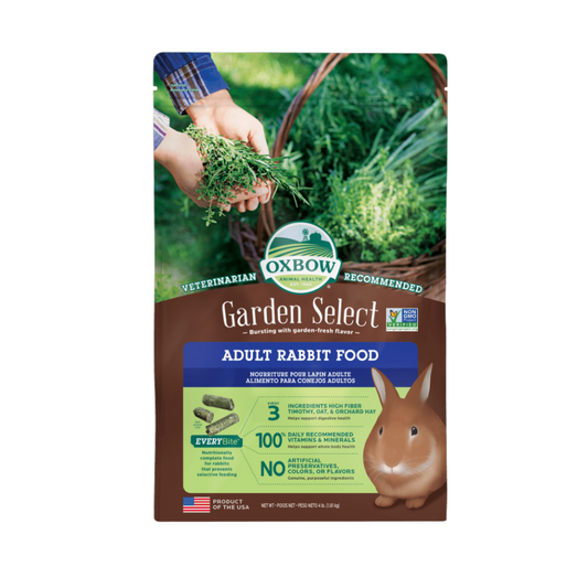 Regular price $26.99Regular priceUnit price / perSale price $26.99Garden Select® Adult Rabbit blends enticing garden favorites with non-GMO (non-genetically engineered) ingredients to support your pet’s healthy, active lifestyle. We start with high fiber Oxbow hays for healthy digestion and add antioxidants and prebiotics to help support whole body health. Garden Select® Adult Rabbit provides 100% of your pet’s daily recommended vitamins and minerals with no artificial preservatives, colors or flavors.